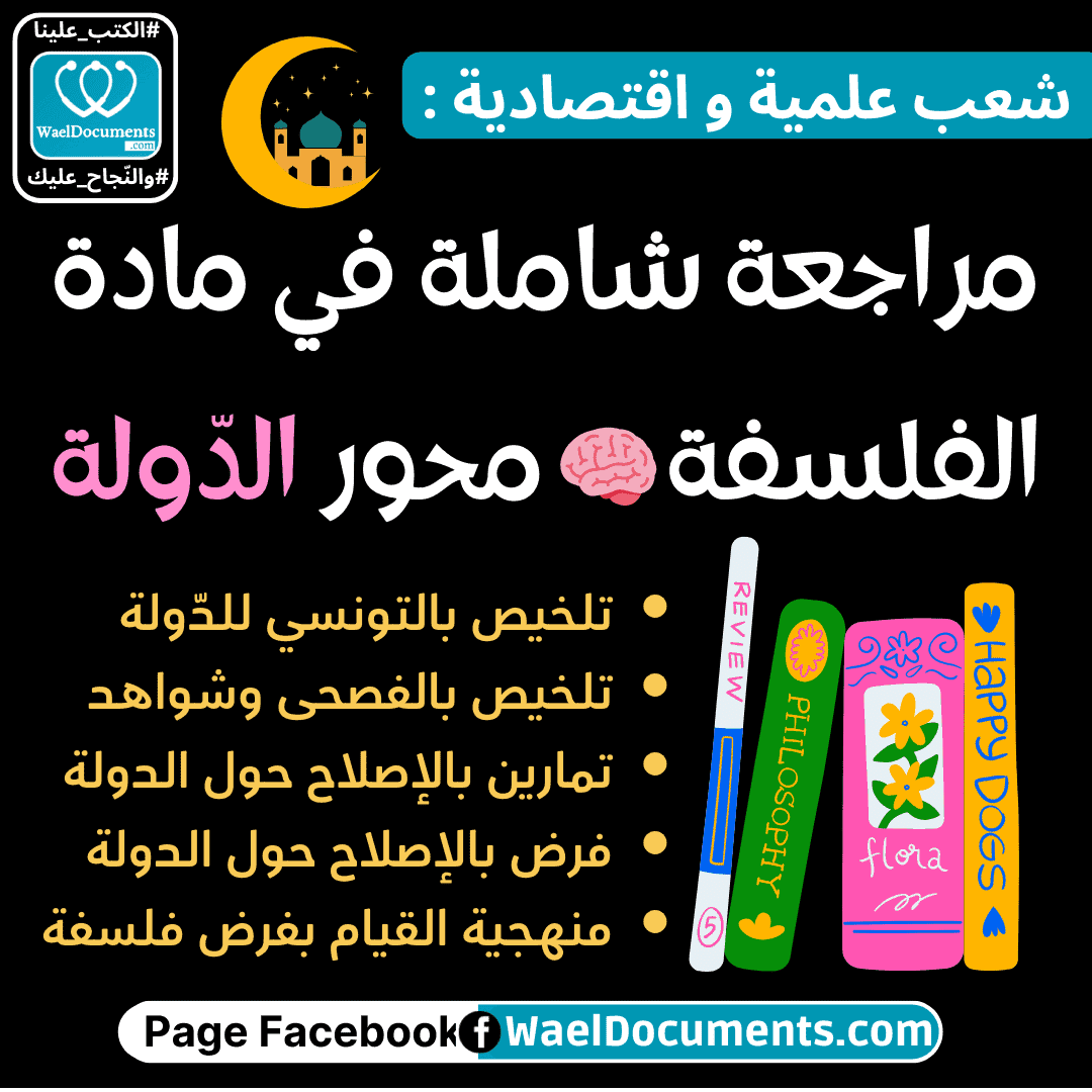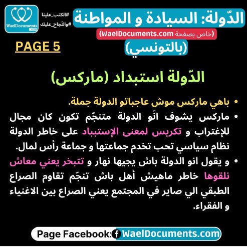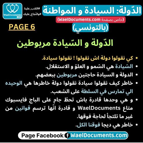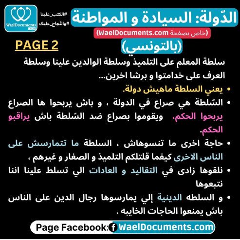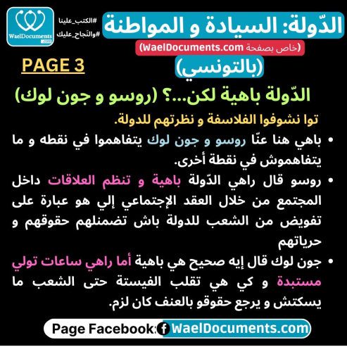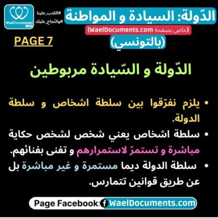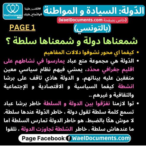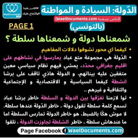 $\cdot$ كيفما اي محور نشوفوا دلالات المفاهيم $\cdot$ الدّولة هي مجموعة متع عباد يمارسوا في نشاطهم على اقليم جغرافي محدّد، يمشي فيهم نظام سياسي معين متفقين عليه بيناتهم، و الدولة هاذي تاقف على برشا انشطة كيفما السياسية و الاقتصادية و الإجتماعية والثقافية و غيرهم .. $\cdot$ توا لازمنا نفرّقوا بين الدولة و السلطة خاطر برشا عباد تسمع كلمة سلطة تقول دولة ، خاطر الدّولة عندها سلطة. لا موش هكّا بالضبط، هو خاطر الدولة تمارس السلطة اما ما عندهاش سلطة ، خاطر السّلطة تجاوزت الدولة ، نلقوا Page Facebook: $\mathbf{f}$ WaelDocuments.com