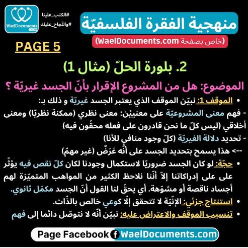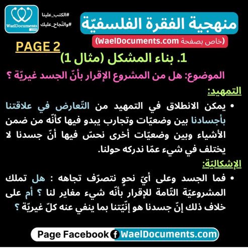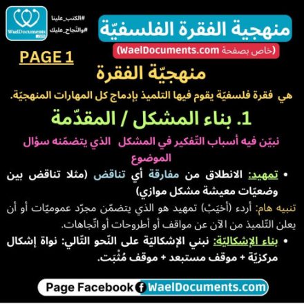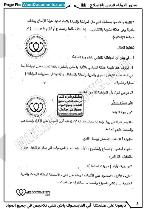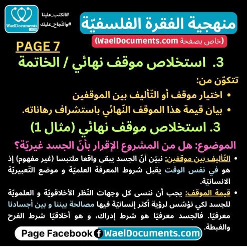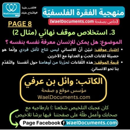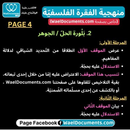 $\cdot$ عرض الموقف الأوّل انطلاقا من التّحديد السّياقي لدلالة المفاهيم. $\cdot$ الاستدلال عليه بحجّة. $\cdot$ تنسيب هذا الموقف: الاعتراض عليه إمّا من خلال إحدى تبعاته، بقية التلاخيص تلقاوها على صفحتنا WaelDocuments.com: أو بالكشف عن إحدى مسلّماته الضّمنيّة. المرحلة الثّانية: $\cdot$ بيان الموقف الثّاني $\cdot$ الاستدلال عليه بحجّة. Page Facebook $\mathbf{f}$ WaelDocuments.com