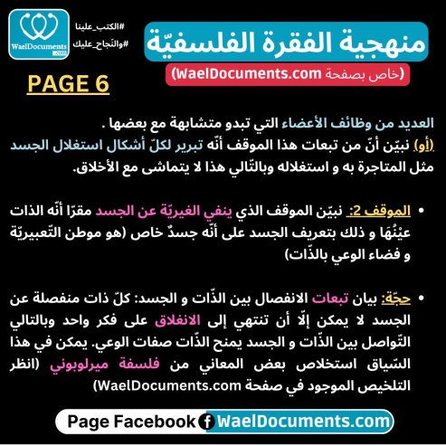 الموضوع: هل من المشروع الإقرار بأنّ الجسد غيريّة؟ الجان $\cdot$ التّأليفيـبنـوقفين: نبيّن أنّ الجسد يبقى واقعا ملتبسا (غير مفهوم) إذ هو في نفس الوقت يقبل شروط المعرفة العلميّة و موضع التّعبيريّة الانسانيّة. $\cdot$ قيمة الموقفي: يجب أن ننسى كل وجهات النّظر الأخلاقويّة و العلمويّة للجسد لكي نؤسّس لرؤية أكثر إنسانيّة فيها مصالحة بيننا و بين أجسادنا معرفيّا. فالجسد معرفيّا هو شرط إدراك، و هو أخلاقيّا شرط الفرح Page Facebook $\mathbf{f}$ WaelDocuments.com والغبطة.